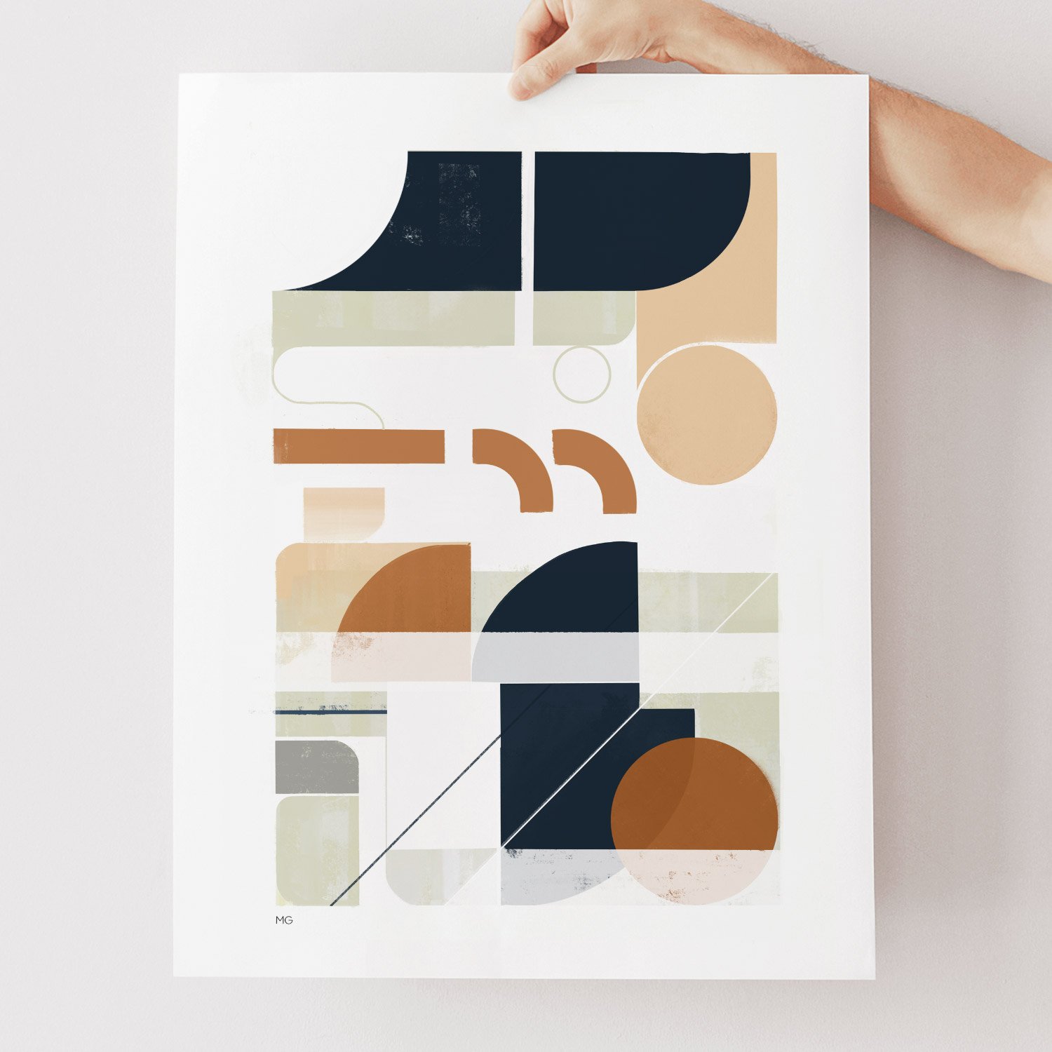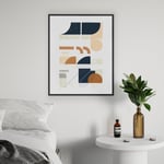 The first in a series, this contemporary abstract art print features a layered expression of geometric form and subtle texture. The palette of cream, navy, and dark orange complement an architectural composition of mid-century inspired shapes and linear elements.