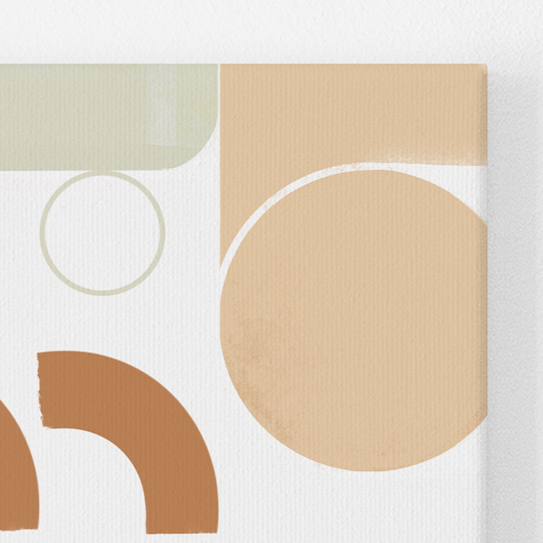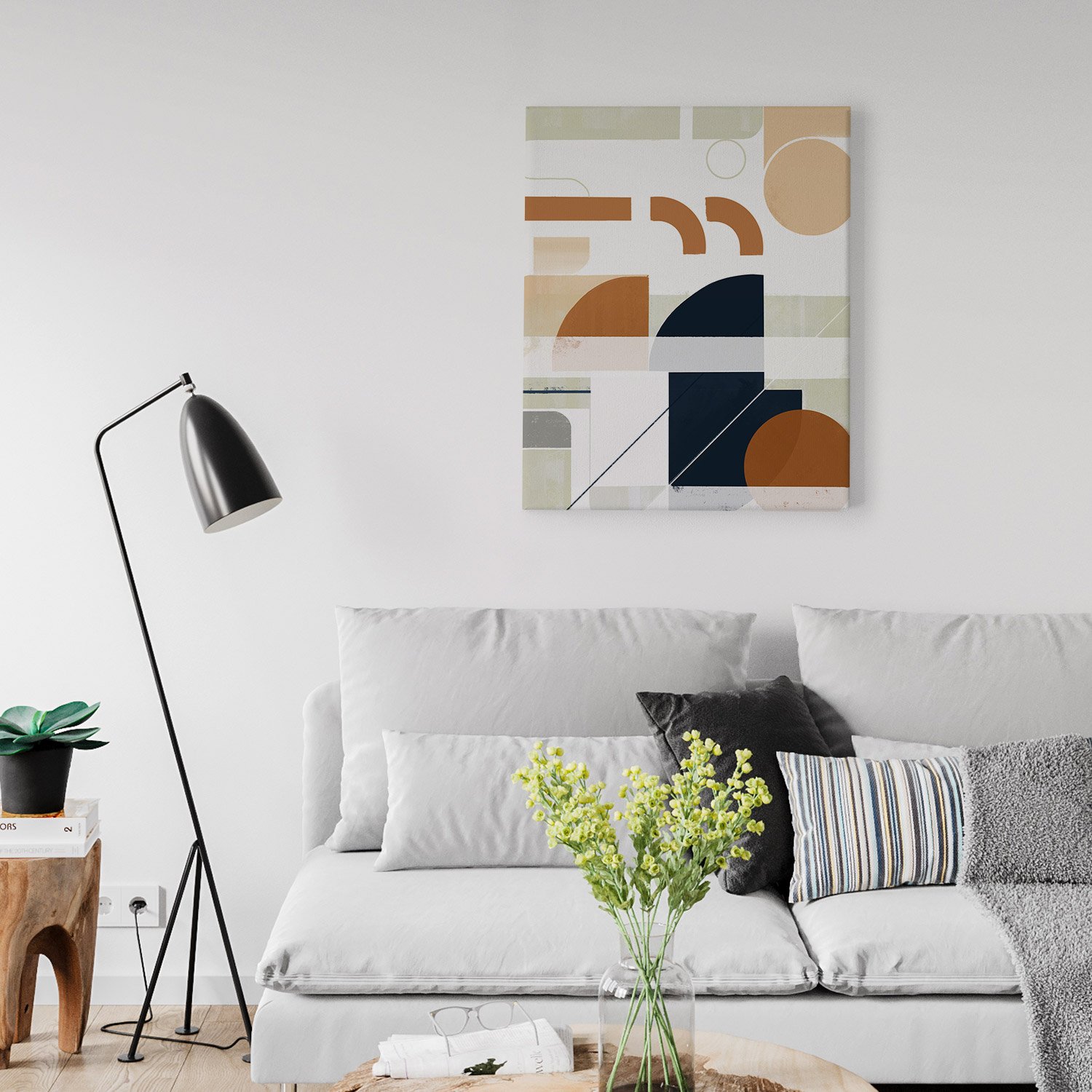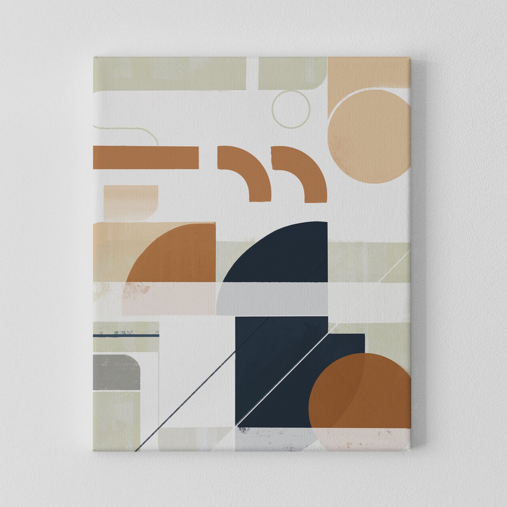 The first in a series, this contemporary art print features a layered expression of geometric form and subtle texture. The palette of cream, navy, and dark orange complement an architectural composition of mid-century inspired shapes and linear elements.