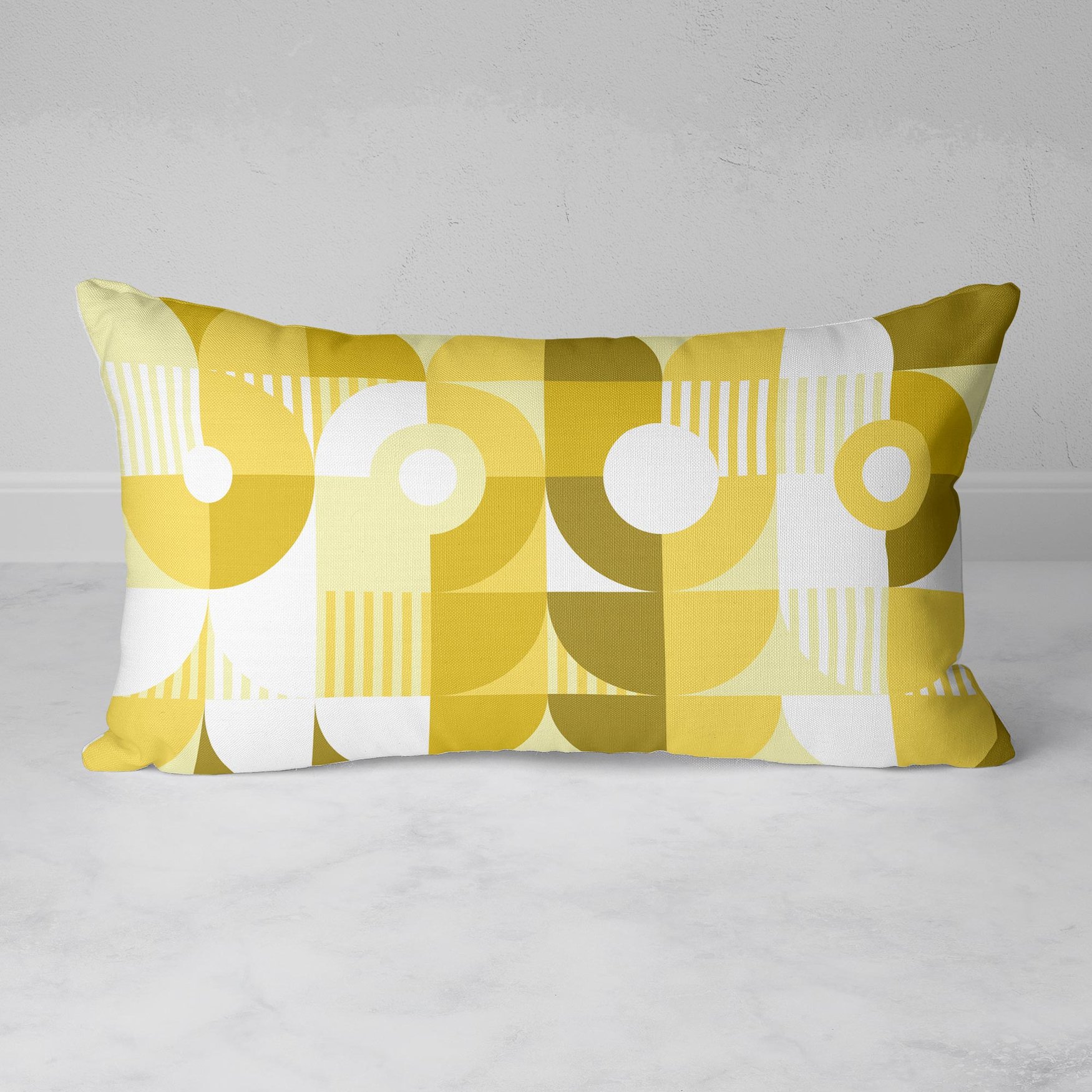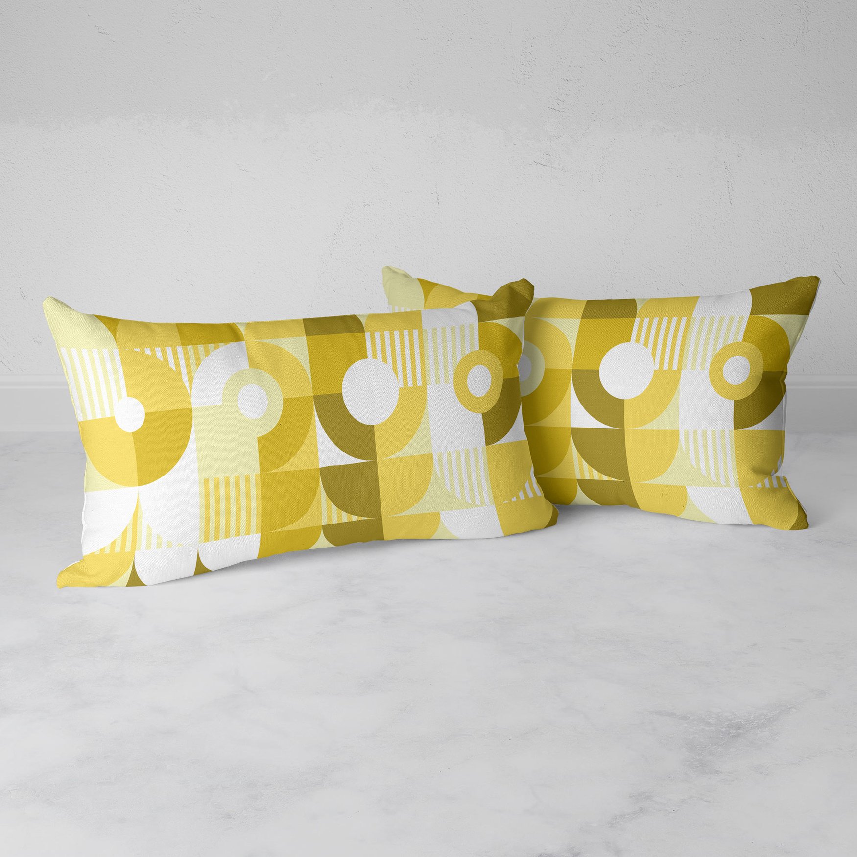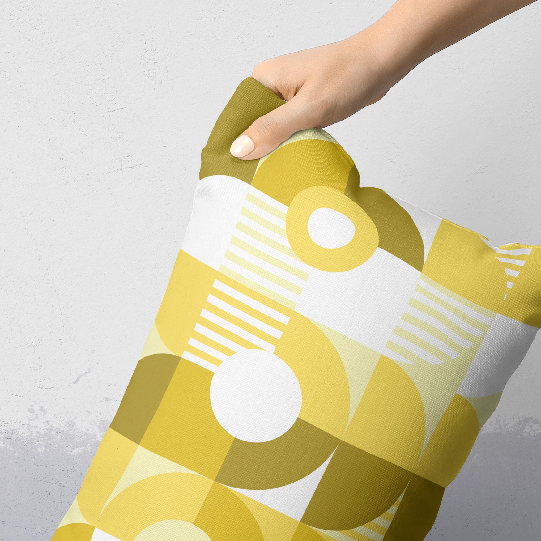 This abstract, geometric print throw pillow features vibrant shapes in alluring shades of yellow and gold. Meticulously composed and layered graphic elements provide visual depth, while patterns create expressive movement with minimalist Scandinavian influences. The design is featured on both sides of the removable case.