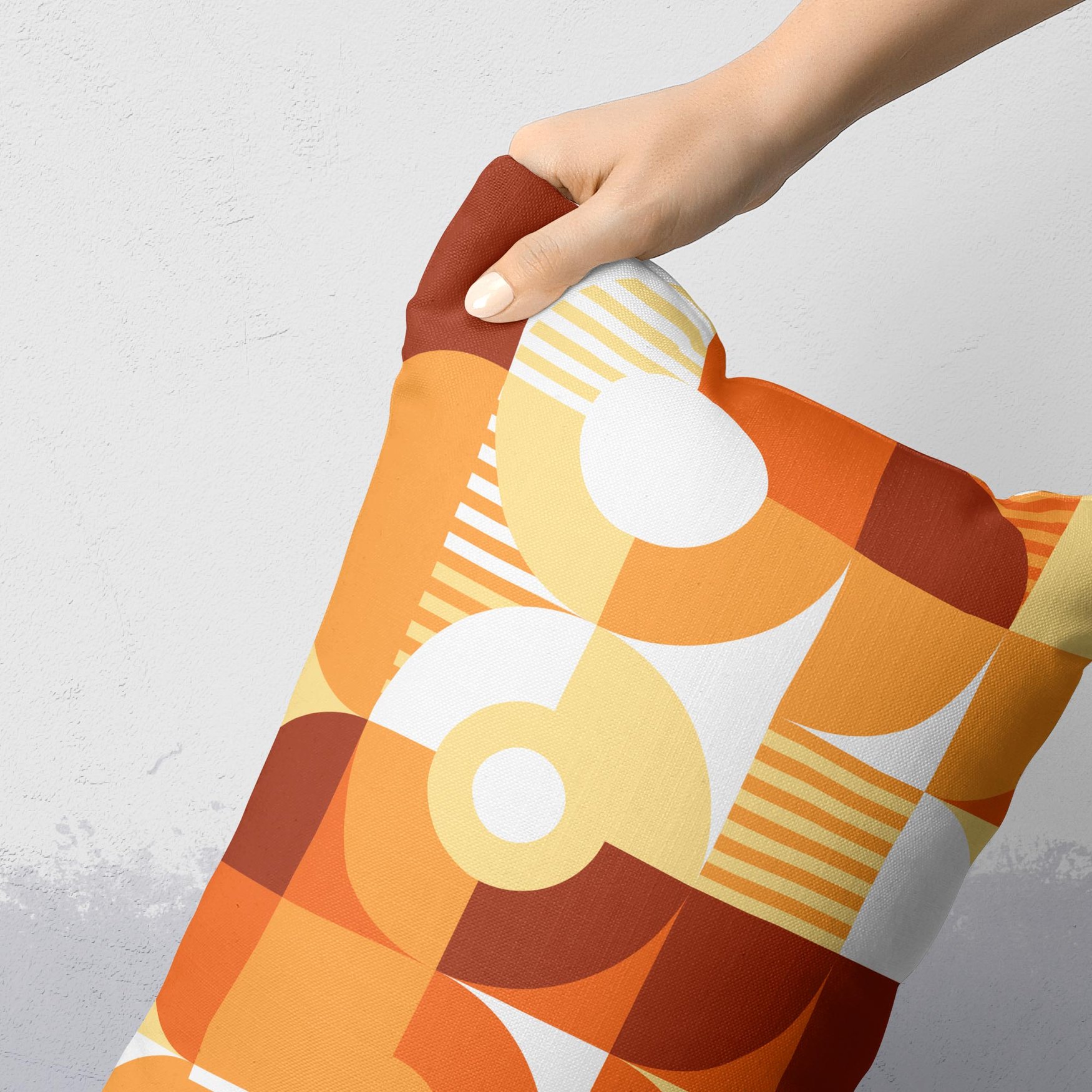 This abstract, geometric print throw pillow features vibrant shapes in alluring shades of tangerine and persimmon. Meticulously composed and layered graphic elements provide visual depth, while patterns create expressive movement with minimalist Scandinavian influences. The design is featured on both sides of the removable case.