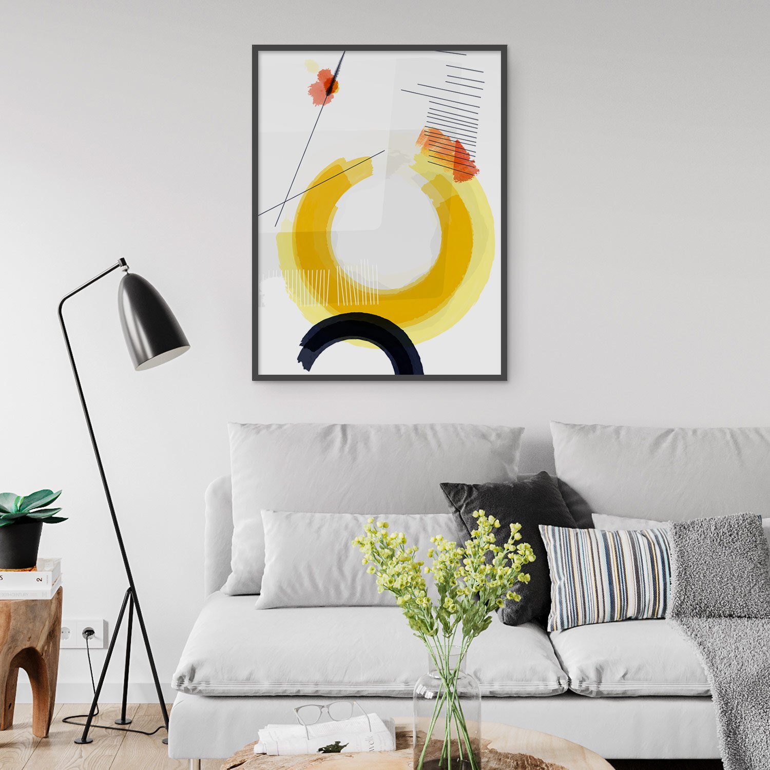 Bold, organic brush strokes in vibrant yellow contrast with thin, graphic lines and soft fields of gray. Part of an abstract print series (2 of 3).