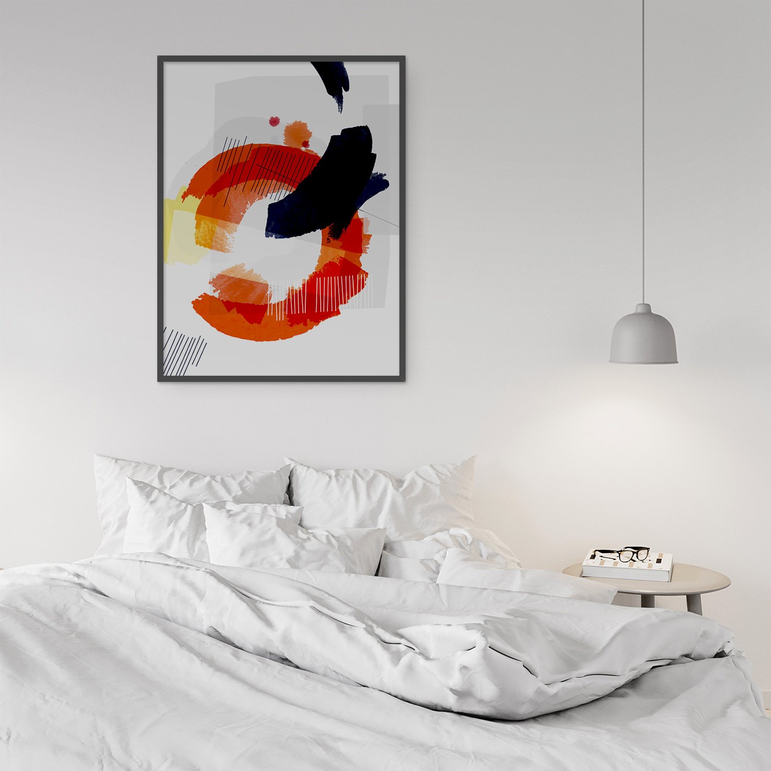 Bold, organic brush strokes in vibrant orange contrast with thin, graphic lines and soft fields of gray. Part of an abstract print series (1 of 3).