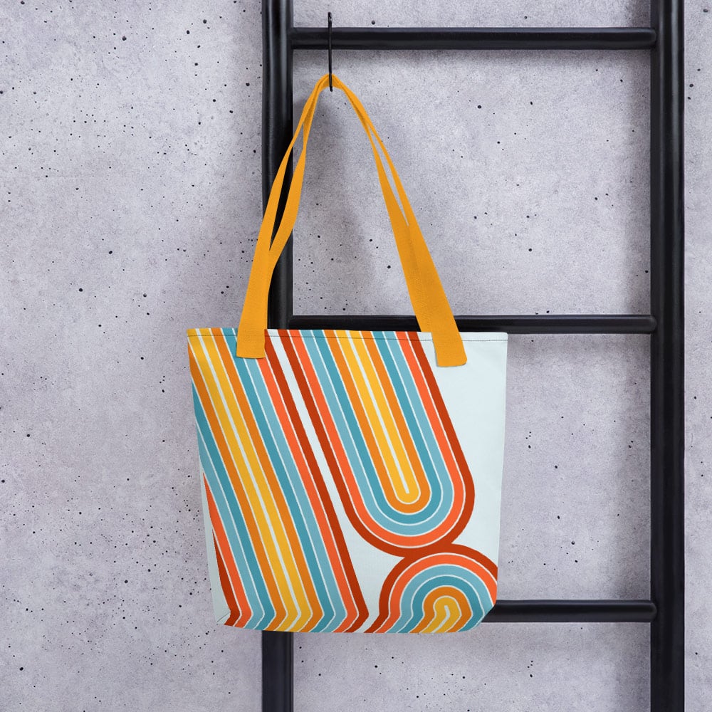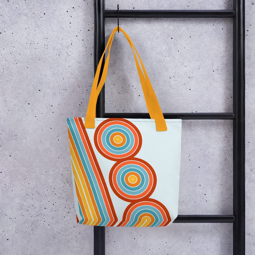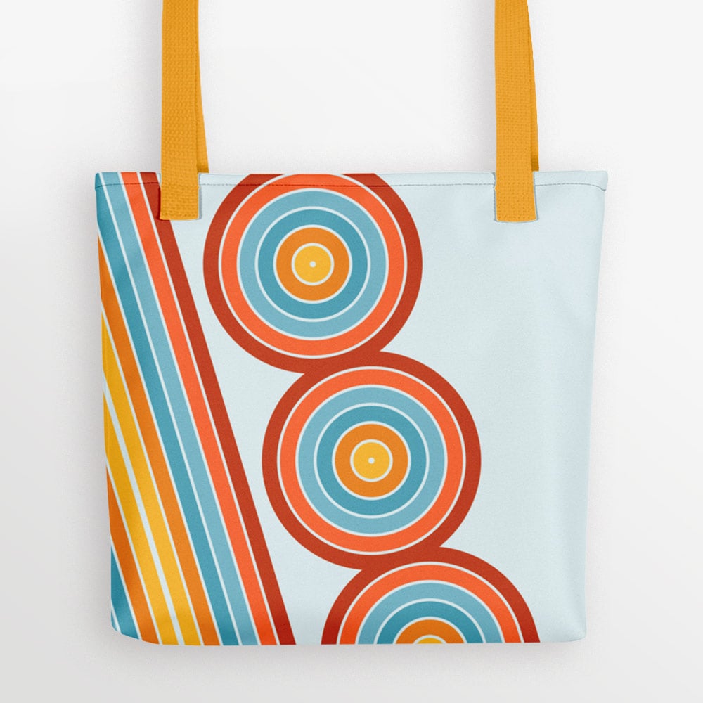 A variation on the original 'Retro Motion' art print is featured on this vibrant fabric tote. The bright, crisp curved stripes and circles are simultaneously modern and vintage. Don't be shy—these colors are perfect for making a statement at the beach (or the grocery store).