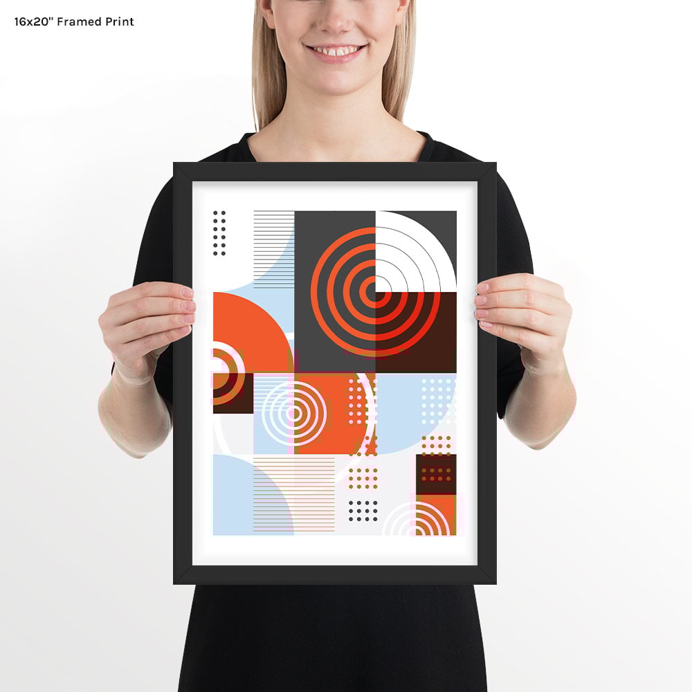 This geometric art print features vibrant, sharp shapes in vivid shades of dark gray, pale blue, and fiery orange-red. Carefully composed, layered graphic elements provide visual depth, while rhythmic patterns create a sense of motion across a minimalist grid.