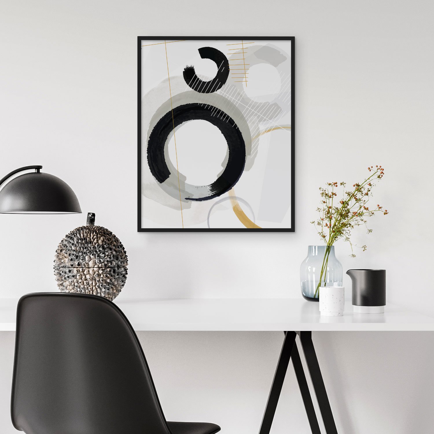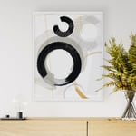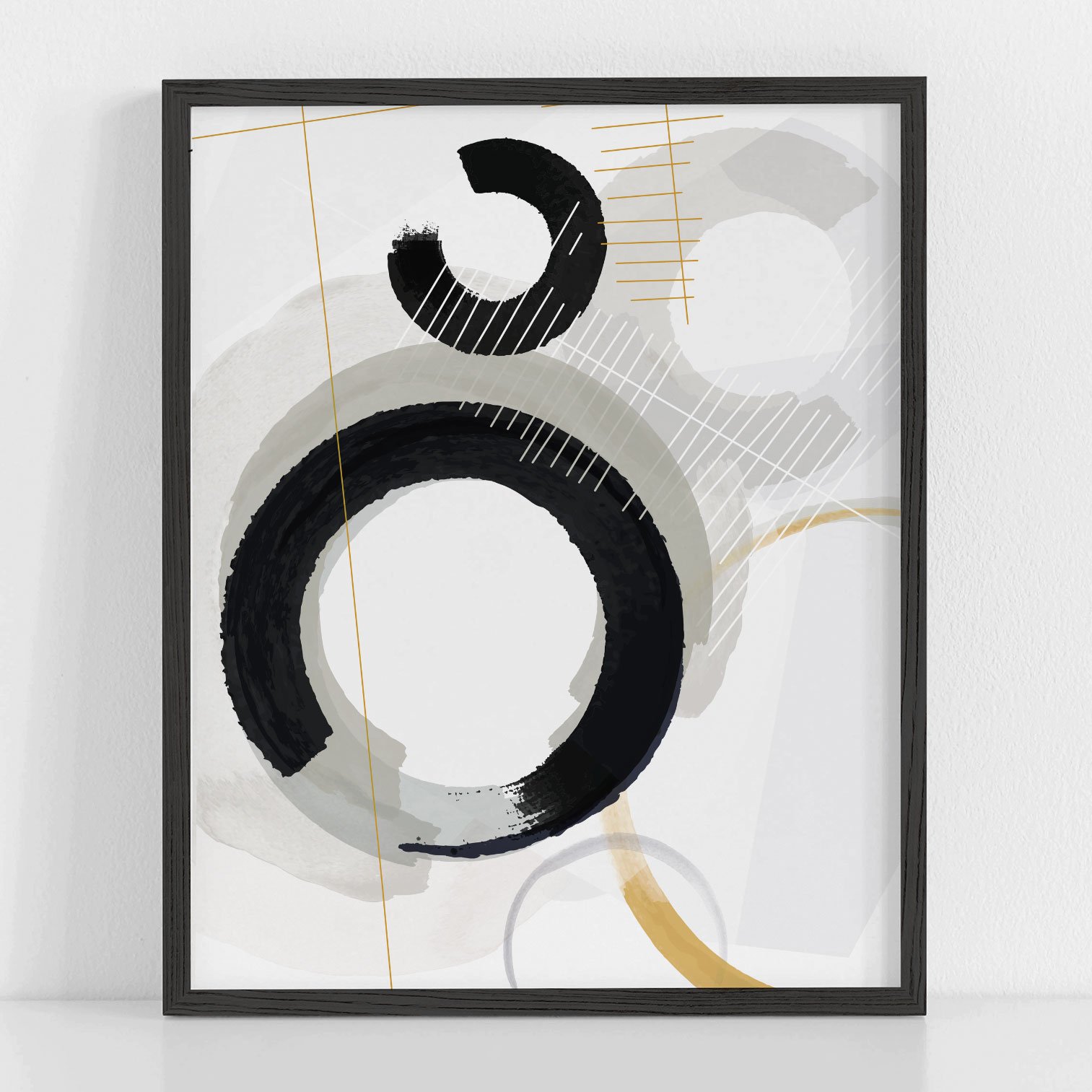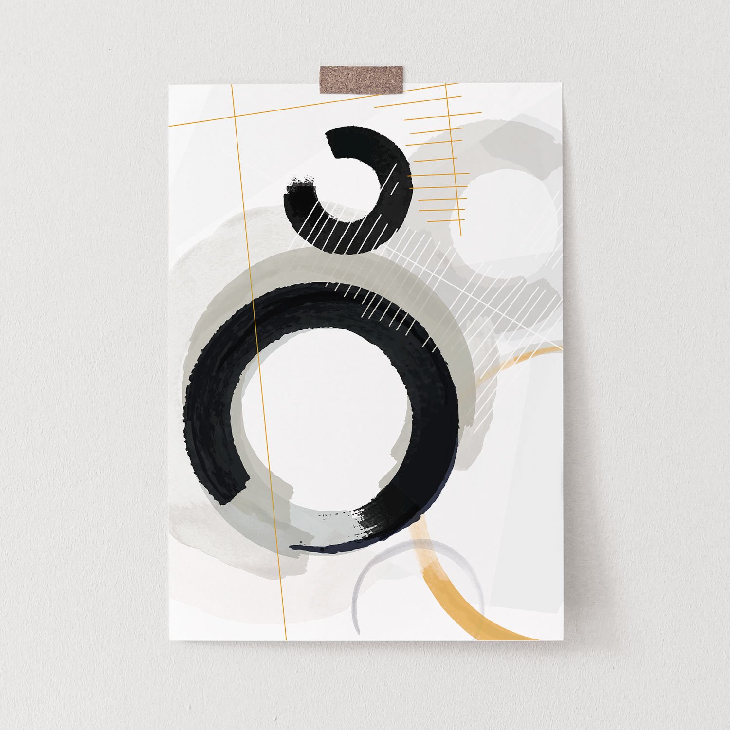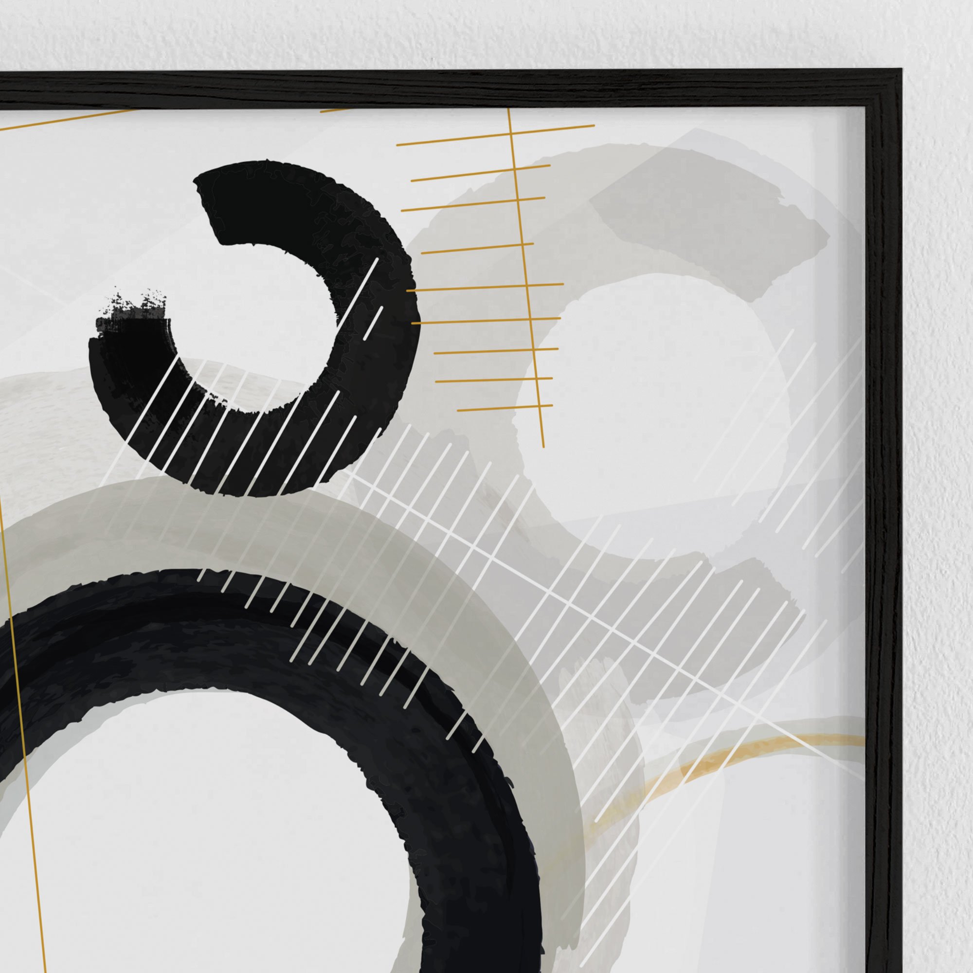Curved shapes in manipulated jet-black ink and monochromatic watercolor collide with golden, hand-drawn linear elements in this abstract composition. Layering adds depth and compelling details.