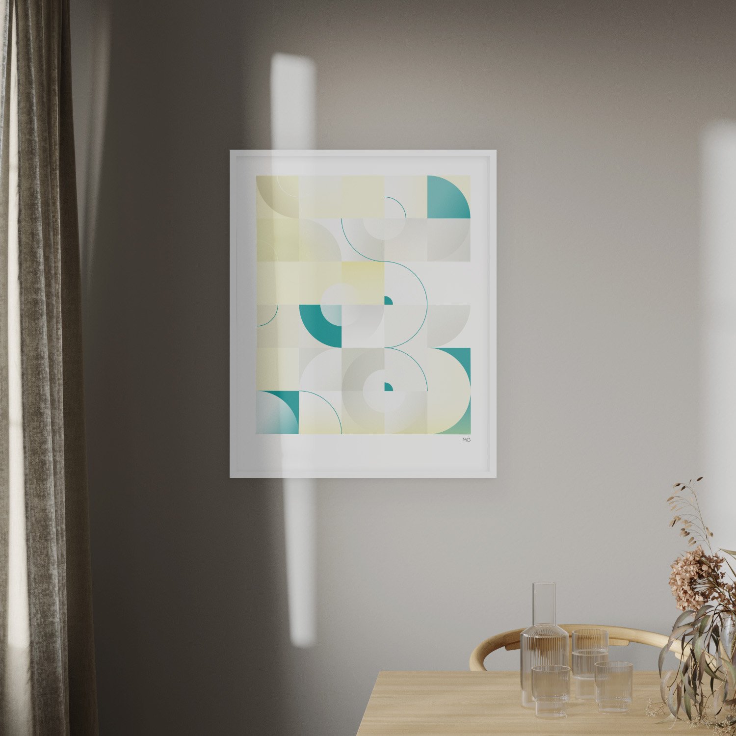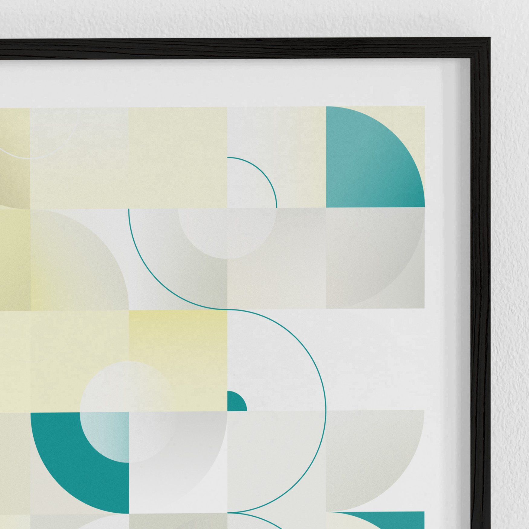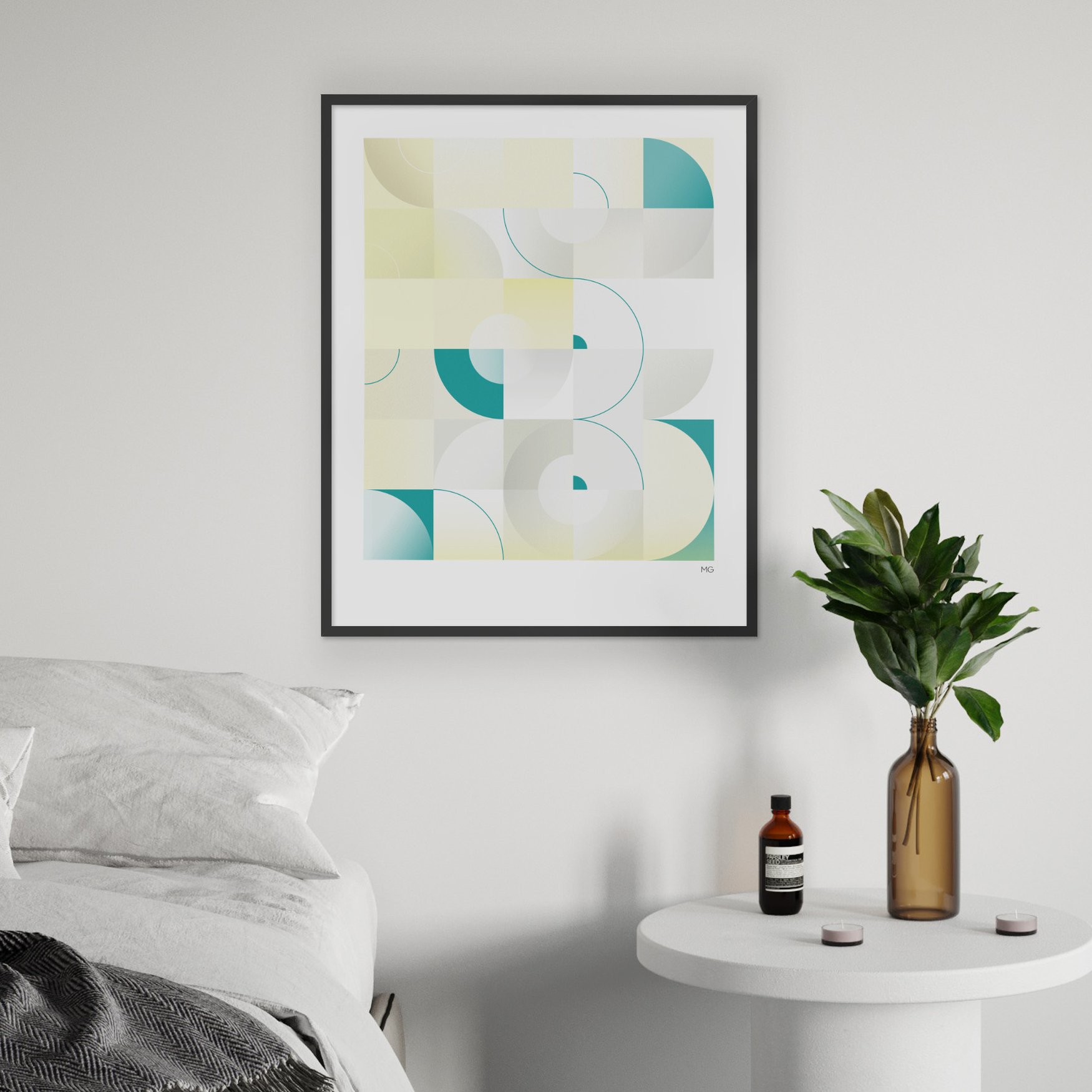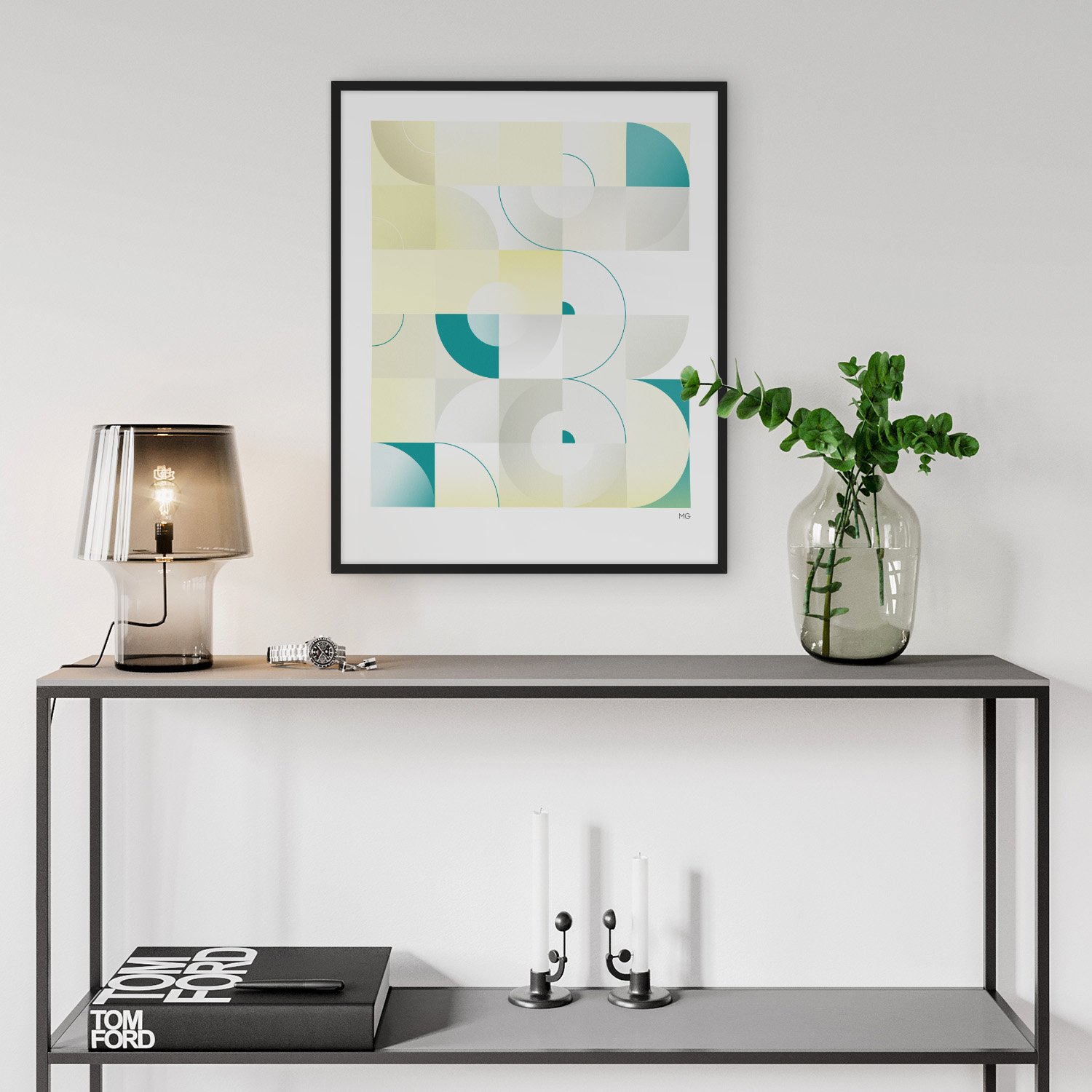 Linear elements combine with soft geometric forms to create a sense of movement, with varied turqoise elements pulling your eyes across the composition.